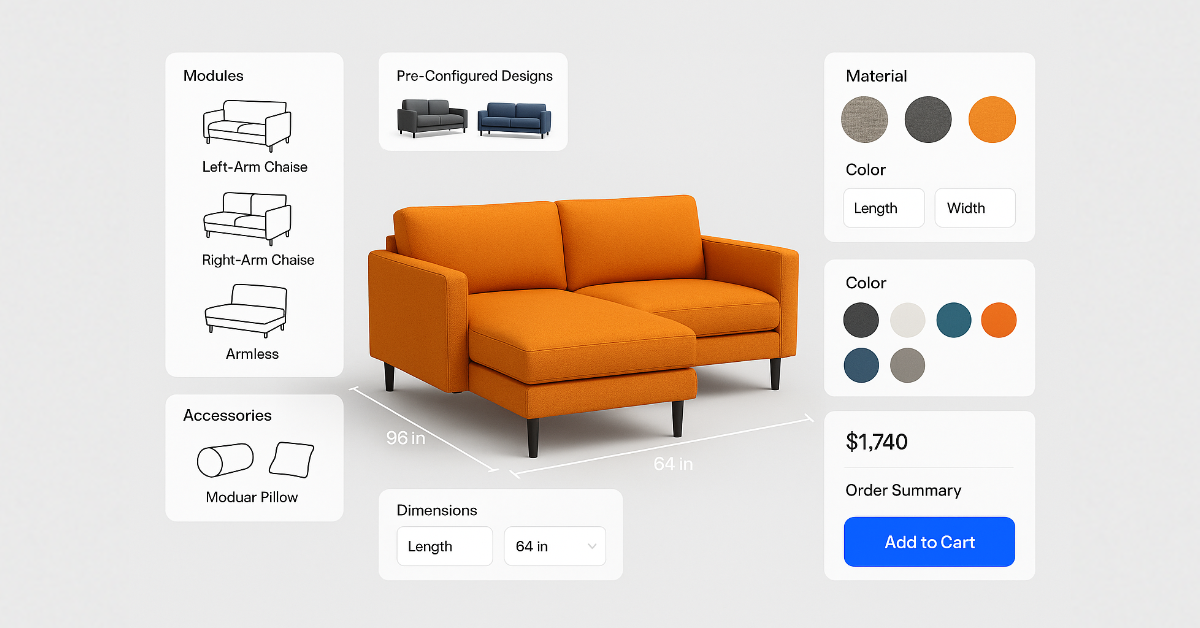 Buyers can configure colors, sizes, finishes, dimensions, layouts, modules, and add-ons for their desired products and then explore their changes from every angle in real time. This reduces back-and-forth communication and confusion and increases conversions.